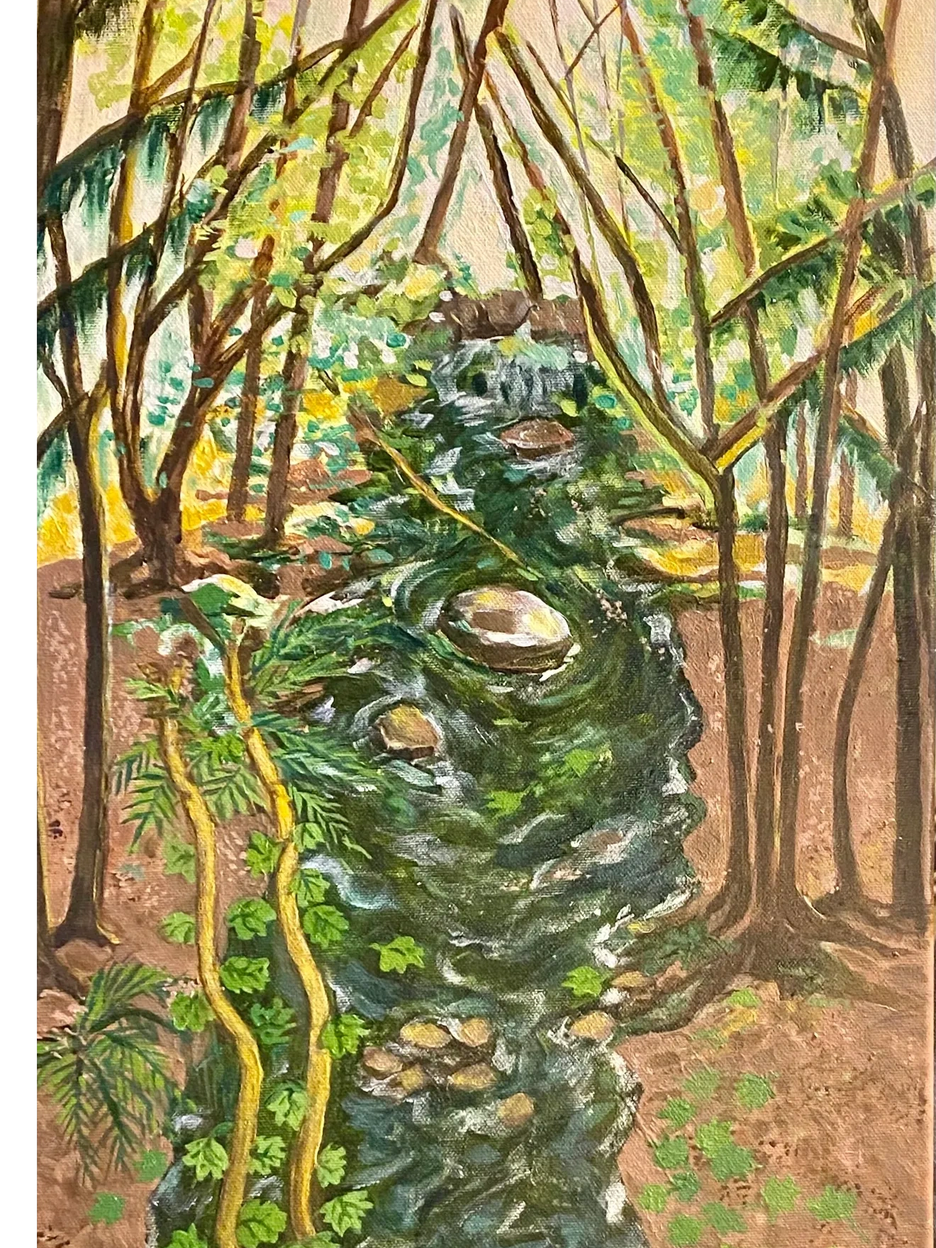 I explore a quiet creek tucked away beneath a dense canopy of trees, that lead you through slender trunks framing a winding stream. In the water of calming shades of green and blue, capture the subtle movement of ripples and eddies around scattered rocks. Along the textured forest floor enlivened by ferns and other foliage interplay the light filtering through it offers a soft dapple quality of peacefulness and seclusion.